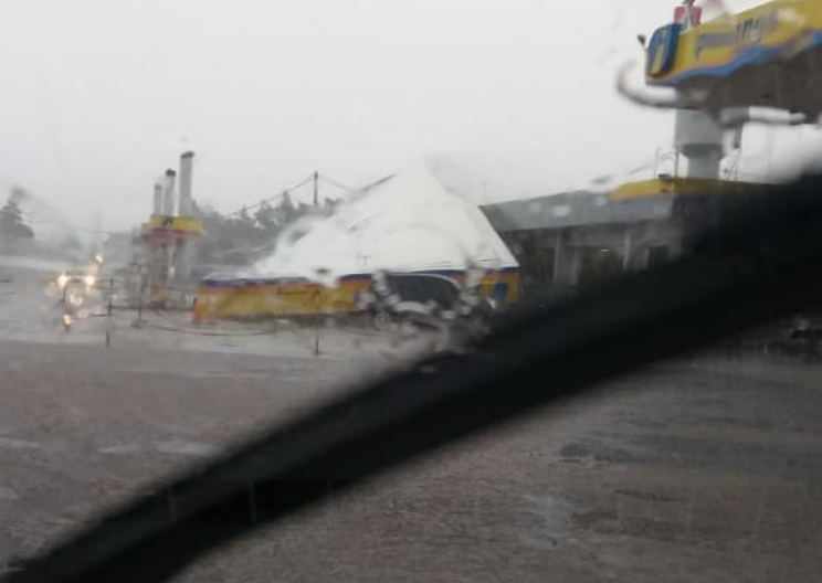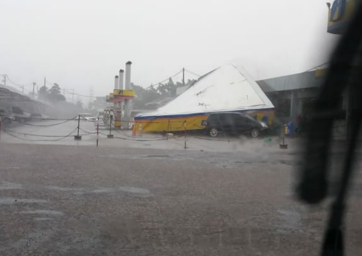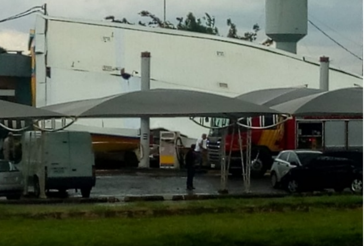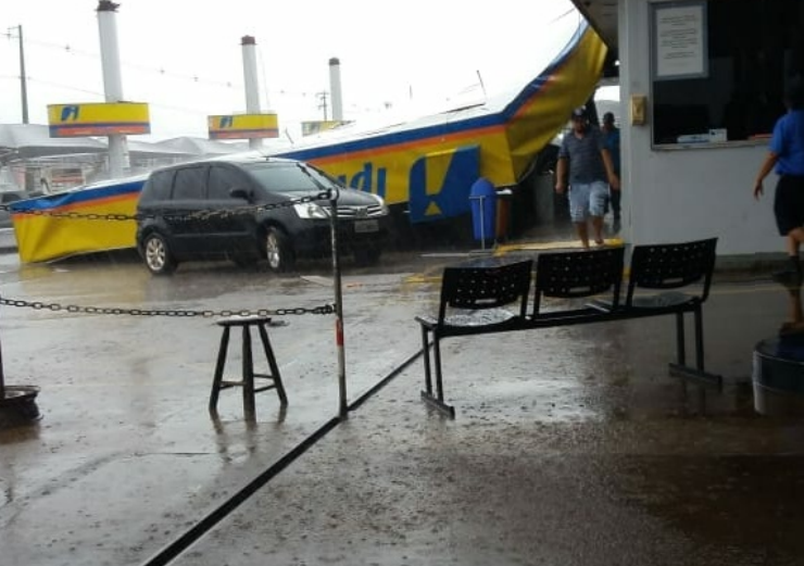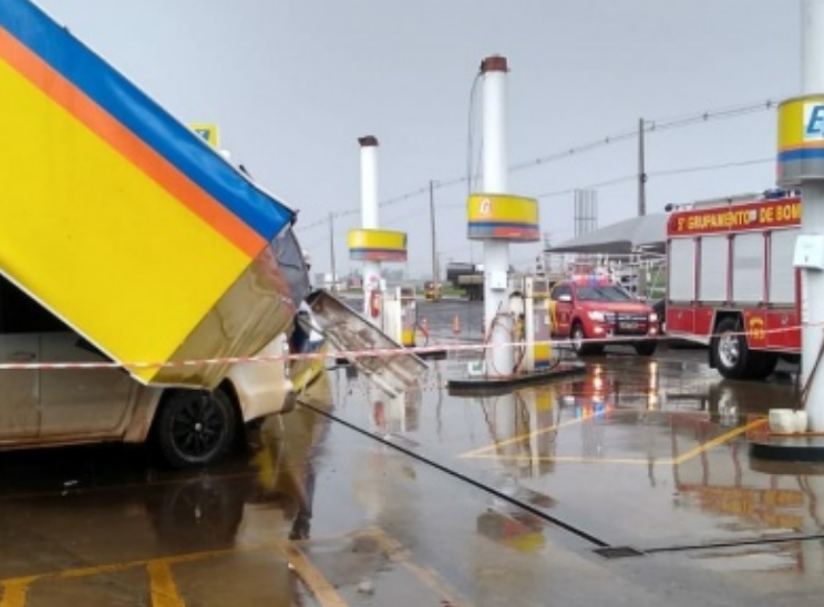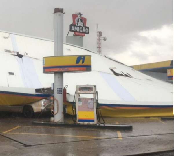 A cobertura de um posto de combustíveis desabou durante um vendaval que passou por Marialva na tarde desta terça-feira (23).