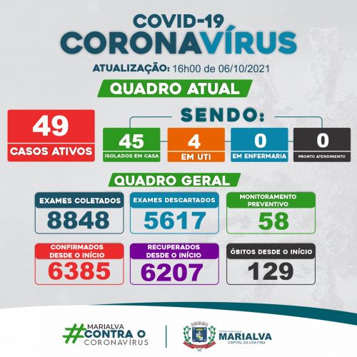 O boletim sobre a situação da Covid-19 em Marialva deste dia 06 de outubro registra apenas 1 novo caso positivo e 9 recuperados, nas últimas 24 horas. Desde o início da pandemia, a cidade registrou 129 óbitos e 6.385 casos, sendo 6.207 já recuperados e 49 casos ainda ativos (45 isolados em casa e 4 internados em estado grave em UTI hospitalar). Os internados confirmados estão, neste momento, em hospitais de Maringá e Sarandi, dois leitos SUS e dois por convênio.Por enquanto, foram coletados na cidade 8.848 exames (além de exames coletados eventualmente em outras cidades e/ou na rede particular), sendo descartados 5.617, 58 casos suspeitos estão sendo monitorados preventivamente pela Saúde de Marialva.Confira o perfil dos novos casos:6385- feminino, 67 anos, Estrada da Mina FONTE: PREFEITURA MUNICIPAL DE MARIALVA