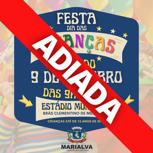 A festa em comemoração ao Dia das Crianças que seria realizada neste sábado, dia 9, no estádio Brás Clementino de Mendonça foi adiada. A secretaria de Esporte, Cultura e Turismo informa que a decisão foi tomada na noite desta sexta-feira por conta da previsão de chuva para este sábado, dia da festa.A secretaria informa que a comemoração será transferida para uma outra data, que em breve será divulgada. Pedimos a compreensão de todos e garantimos que todas as atrações previstas serão mantidas para fazer a alegria das crianças marialvenses.FONTE: PREFEITURA MUNICIPAL DE MARIALVA