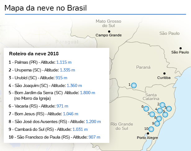 A “rota da neve” brasileira traz cinco cidades no Rio Grande do Sul (São José dos Ausentes, Bom Jesus, São Francisco de Paula, Vacaria e Cambará do Sul), quatro em Santa Catarina (Bom Jardim da Serra, mais especificamente no Morro da Igreja; São Joaquim, Urupema e Urubici) e uma no Paraná (Palmas).