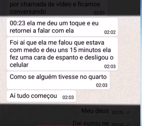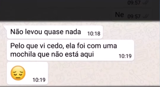 A angústia cresceu quando Cleusa conseguiu falar com um amigo da filha que vive em São Paulo. Era com ele que Andriele falava por chamada de vídeo quando alguma coisa aconteceu e ela desapareceu. Por mensagens de texto, ele contou a mulher sobre o que aconteceu naquela quarta-feira. Segundo o jovem, os dois conversavam quando ela fez uma cara de espanto e desligou o celular. Em seguida, ele mandou uma mensagem dizendo que estava preocupado. Uma hora depois, a resposta veio por mensagem de texto.